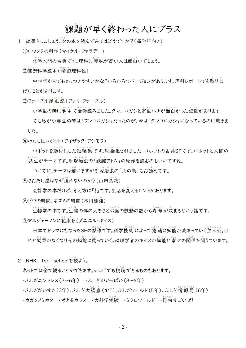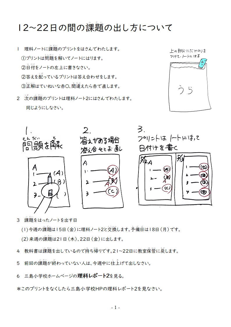 理科の課題説明 2020年5月11日 07時50分 r1215.pdfgr112151.jpg スマホ用P1gr12152.jpg スマホ用P2 上のファイルは分散登校時の理科の課題を説明しているものです。訂正 4、5、6年生とも15日(金)と18日(月)で、ノートの交換をします。
