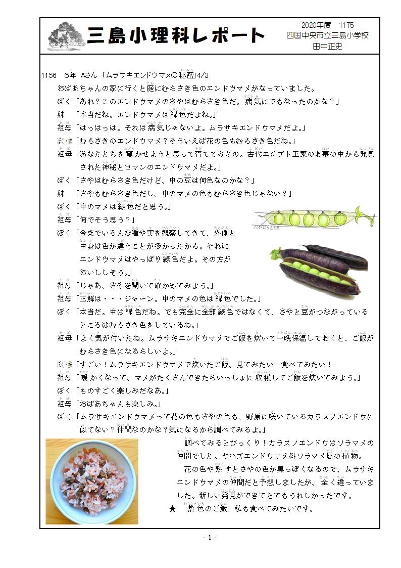 1175 2020年5月20日 06時00分 rr1175.pdfgr1175.jpg スマホ用 1156 ムラサキエンドウマメの秘密・ このマメで炊いた豆ご飯の味は? ムラサキはアントシアンの色だろうから・・・?