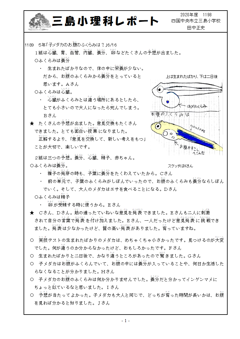 1198 2020年7月2日 06時00分 rr1198.pdfgrr1198.png 1189 5年「子メダカのお腹(なか)のふくらみは?」 1組は、たくさんの予想が出ました。意見交換ができて面白かったです。2組は、予想は少なかったけれど、ていねいな筋の通った発表に感心しました。