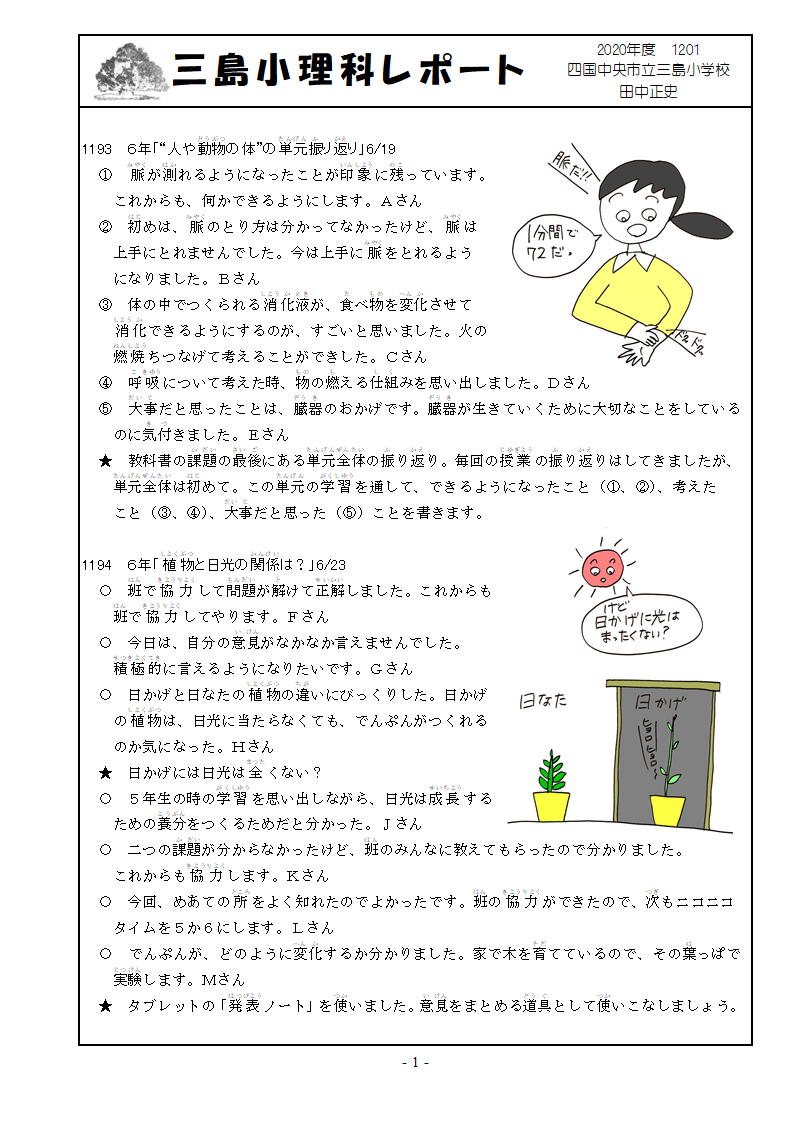 1201 2020年7月7日 06時00分 rr1201.pdfgrr1201.jpg 1193 6年「“人や動物の体”の単元振り返り」 脈はとれるようになろう。そして普段の自分の脈の数を覚えておこう。1194 6年「植物と日光の関係は」 日陰には光はまったくない・・・かな?